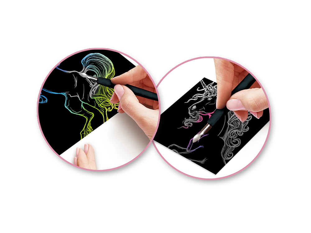 A colorful world of creativity awaits you with this Deluxe Engraving Kit. Create a beautiful work of art as you etch away the black coating and reveal the vibrant colors beneath. Each kit includes everything you need to bring your sheet to life. Follow the outlines, but let your imagination decide how much detail to reveal. Perfect for crafters of all levels!