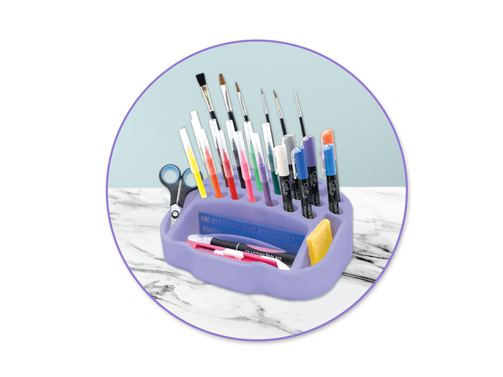 This Desktop Organizer is not your everyday storage container. With 24 round slots, a large bulk storage area, and 2 medium size side slots, this handy organizer is great for sorting and storing brushes, paint markers, scissors, shaping tools and other crafting essentials!