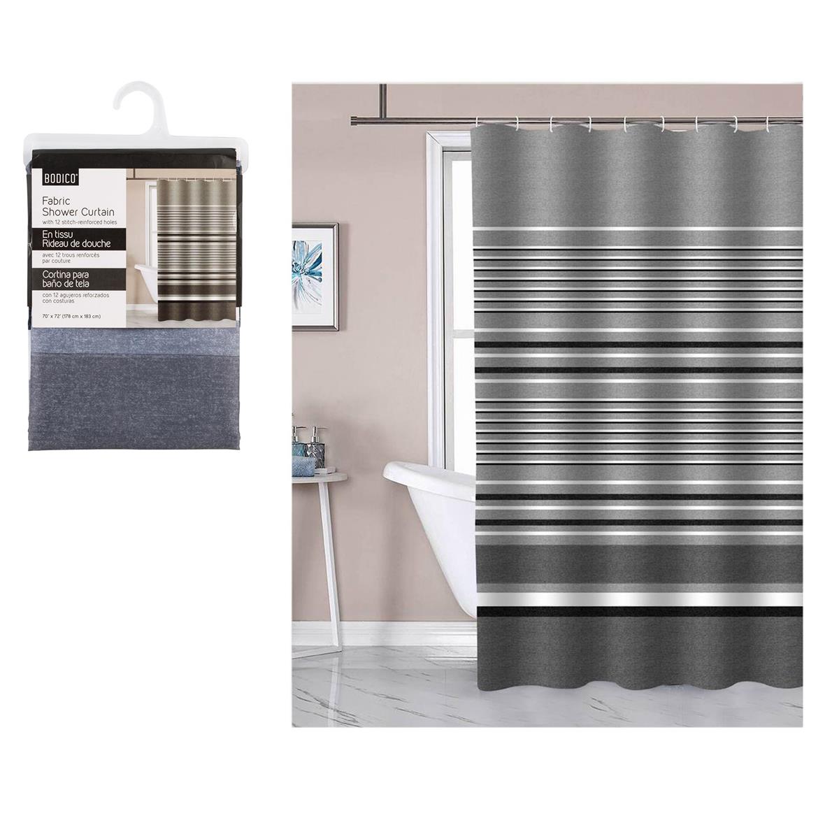 Bodico Fabric Shower Curtain, grey stripes, 70x72", hanger